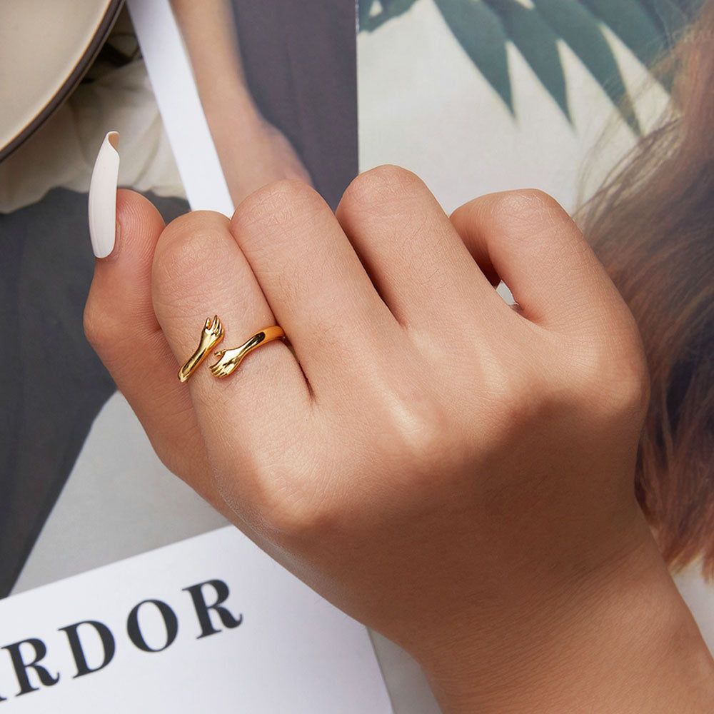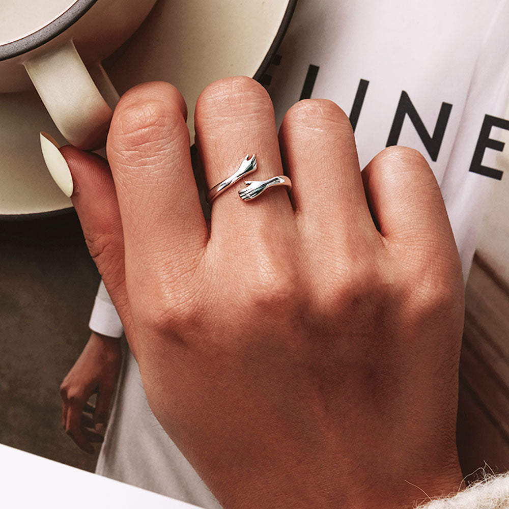 اشعر بدفء عناق أبدي مع هذه الخاتم. هذه القطعة الفريدة تمثل يدين تضغطان برفق على إصبعك، على صورة عناق أبدي. أكثر من مجرد خاتم، إنه رمز للراحة والحب يمكنك ارتداؤه كل يوم.